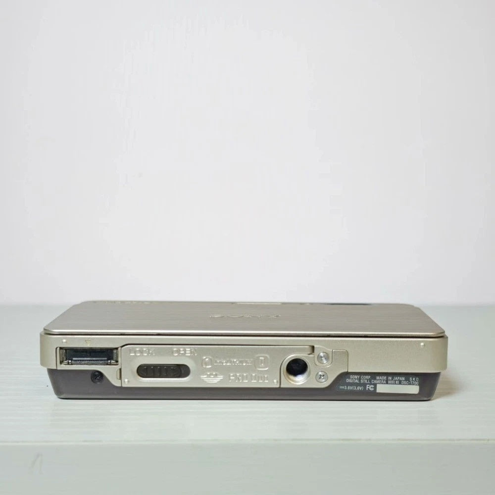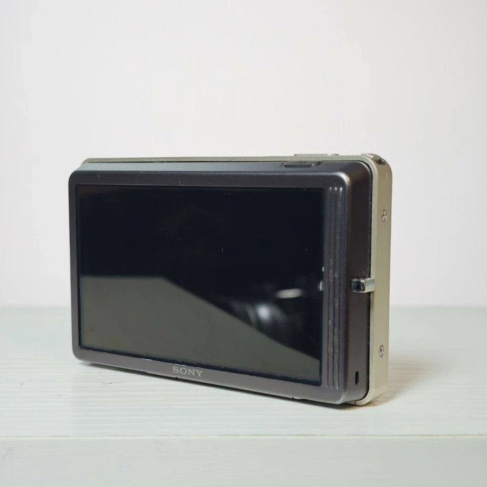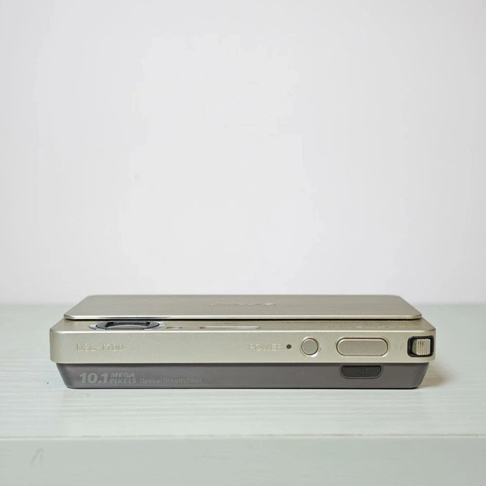 The ultimate "statement" digicam. This Sony DSC-T700 in champagne gold is the peak of late-2000s elegance. Itโ€™s famous for its ultra-slim sliding design and a massive 3.5-inch touchscreen that covers the entire back. It produces a sharp, high-contrast "party flash" look that is essential for the "Digital Archive" aesthetic.